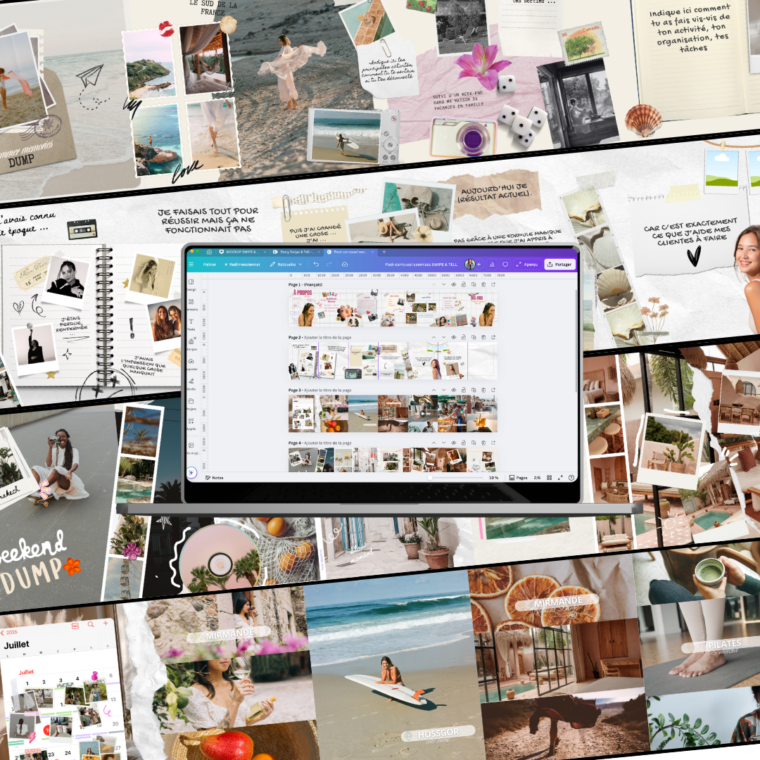 Ton Pack de Templates + un atelier vidéo exclusif de 45min où je te montre, pas à pas, ma méthode complète pour créer & personnaliser des carrousels storytelling impactants.